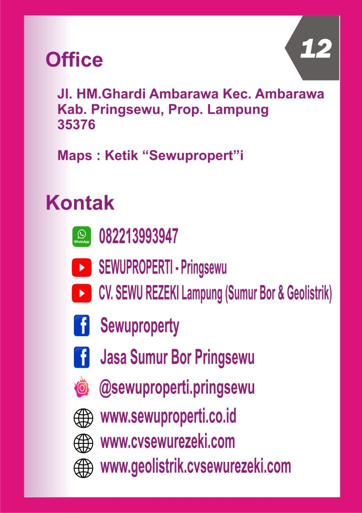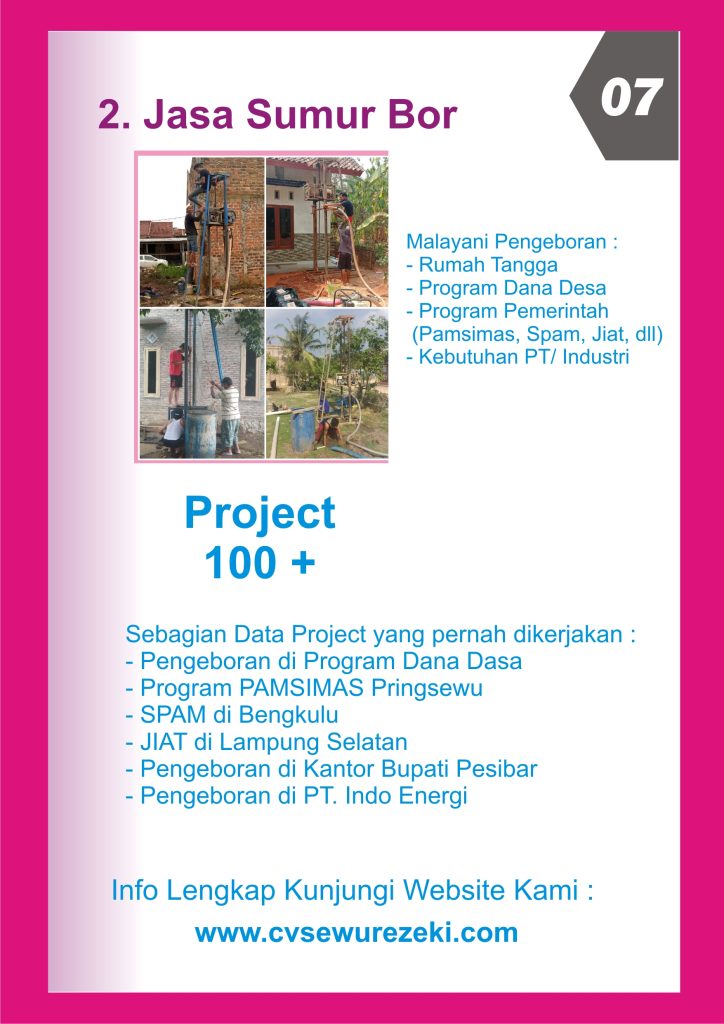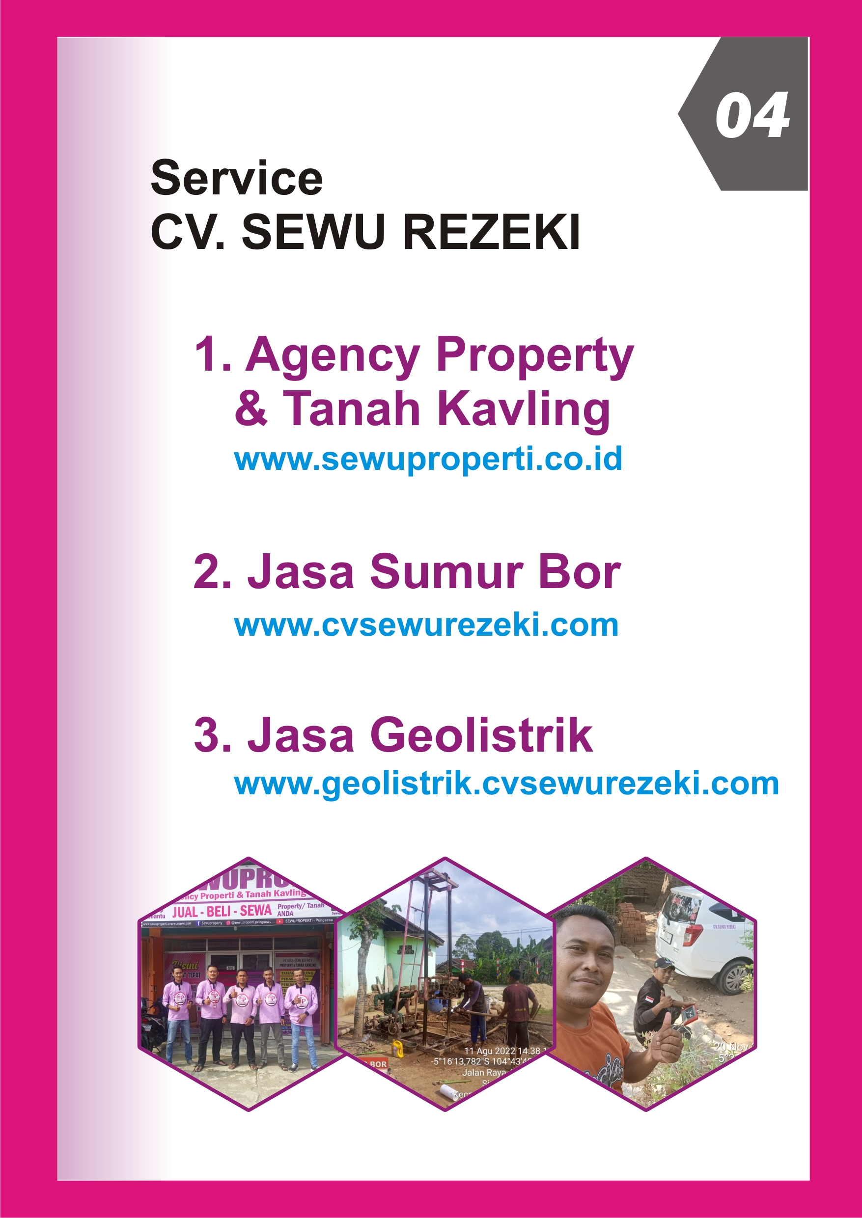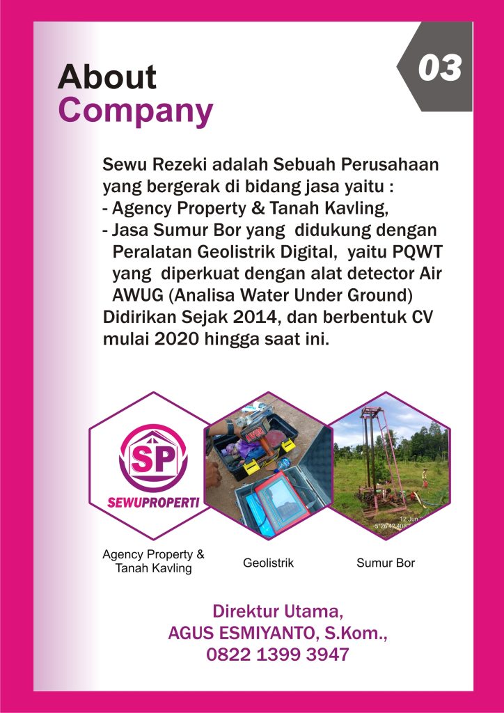 CV. SEWU REZEKI memiliki beberapa bidang usaha yaitu JASA SUMUR BOR, JASA GEOLISTRIK dan REAL ESTATE AGENT, yang wilayah layanannya mengutamakan di Kabupaten Pringsewu Lampung.