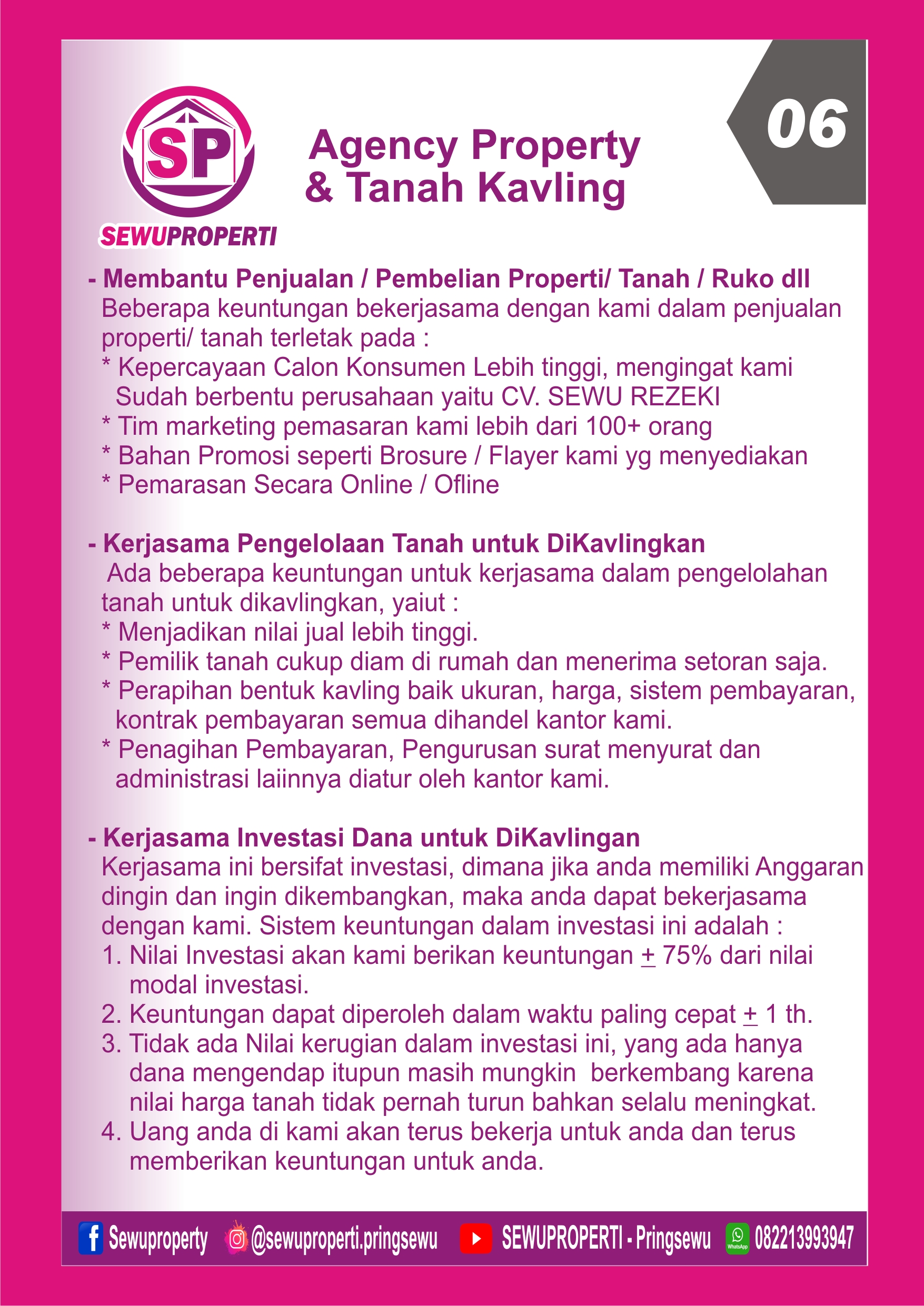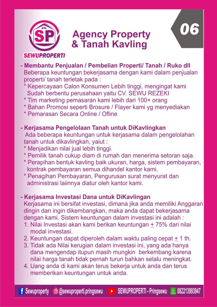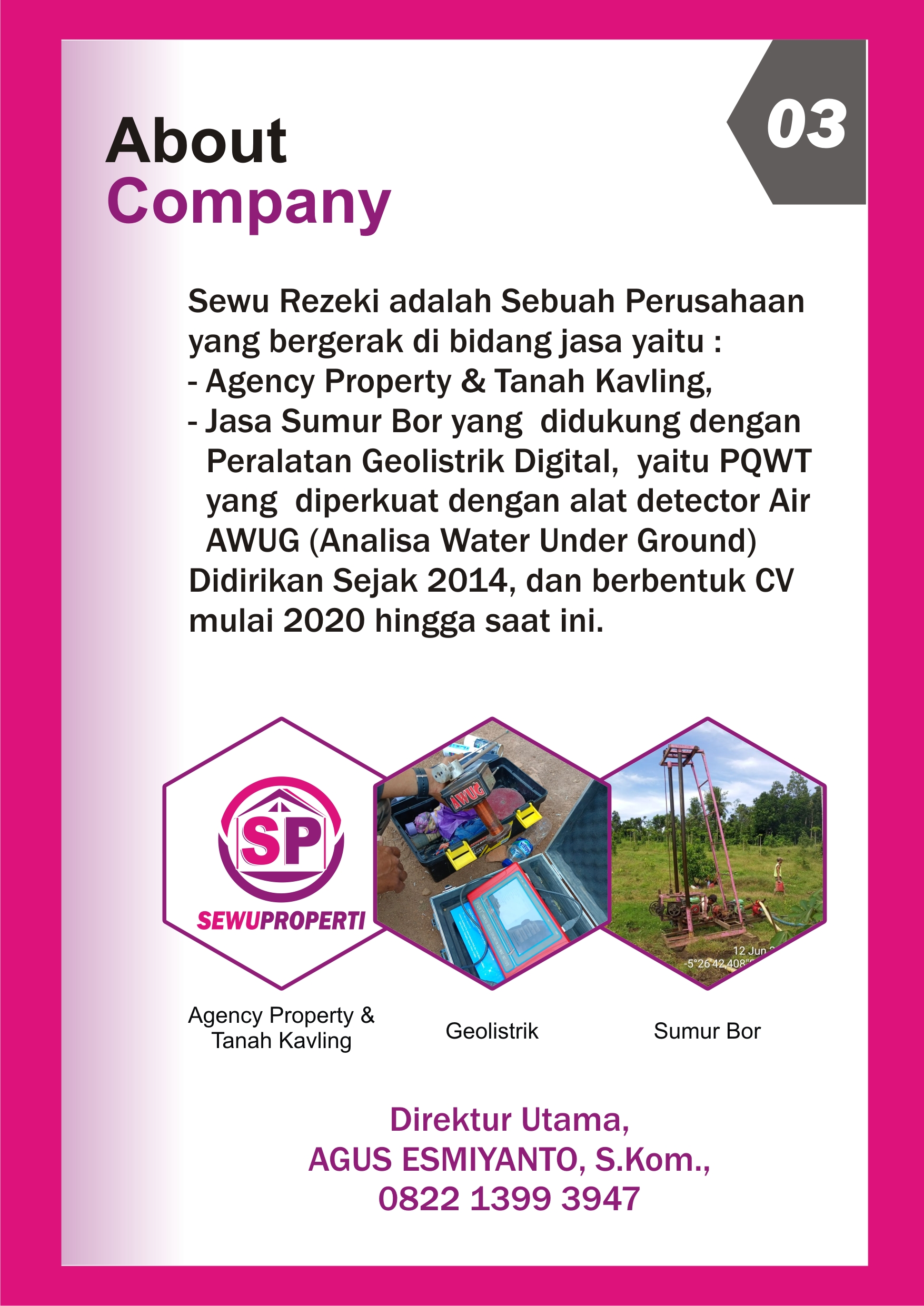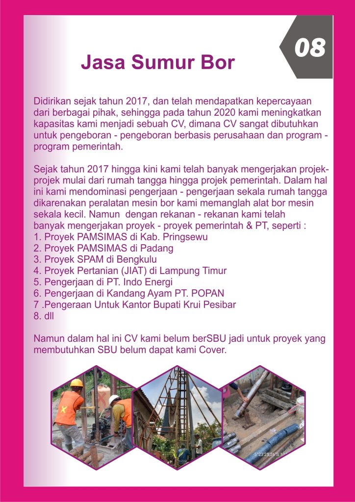 CV. SEWU REZEKI memiliki beberapa bidang usaha yaitu JASA SUMUR BOR, JASA GEOLISTRIK dan REAL ESTATE AGENT, yang wilayah layanannya mengutamakan di Kabupaten Pringsewu Lampung.